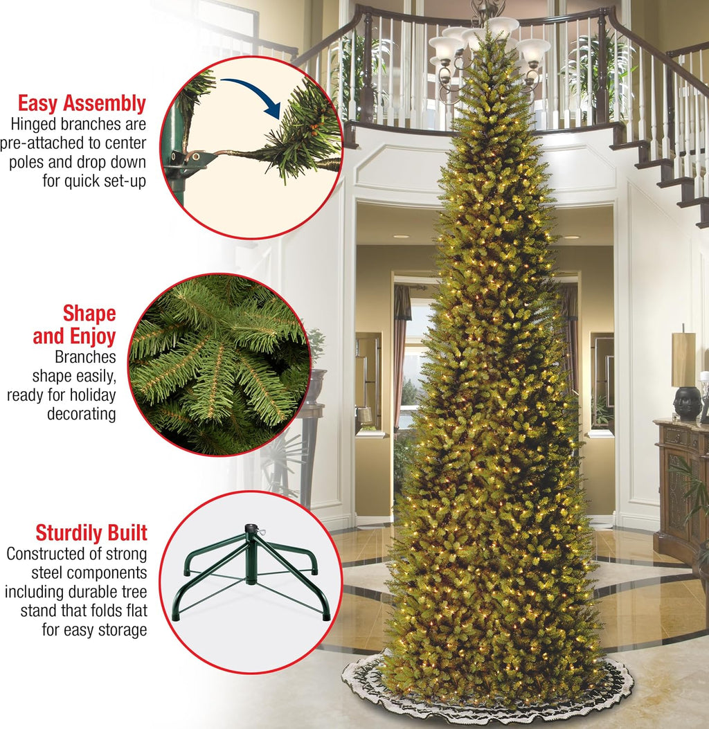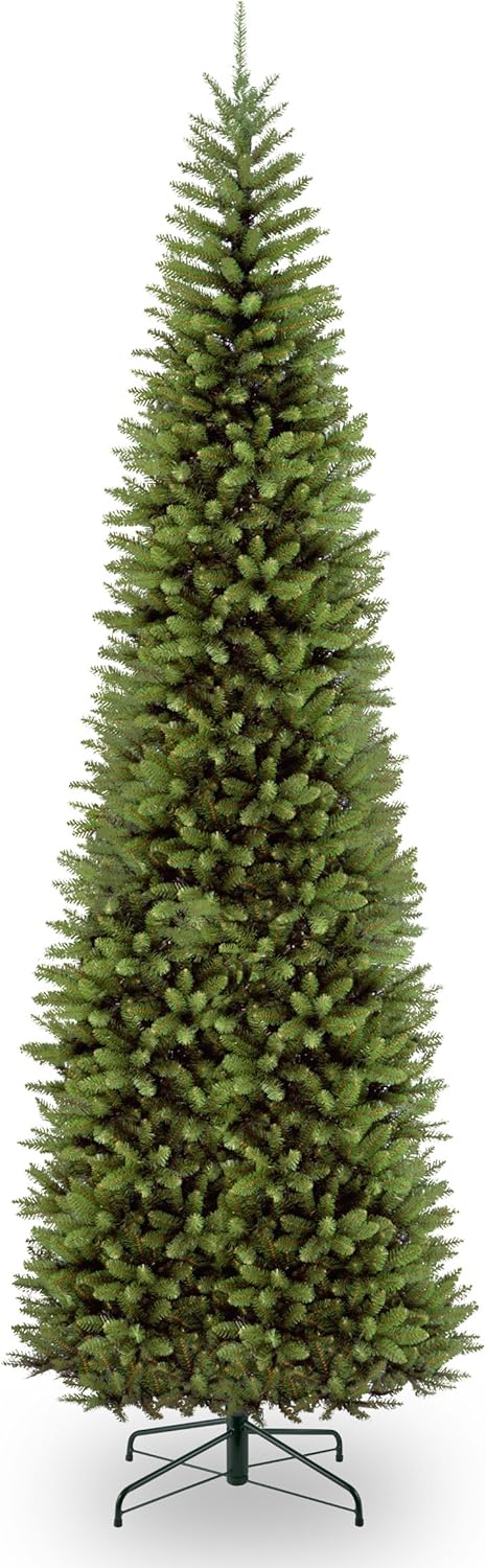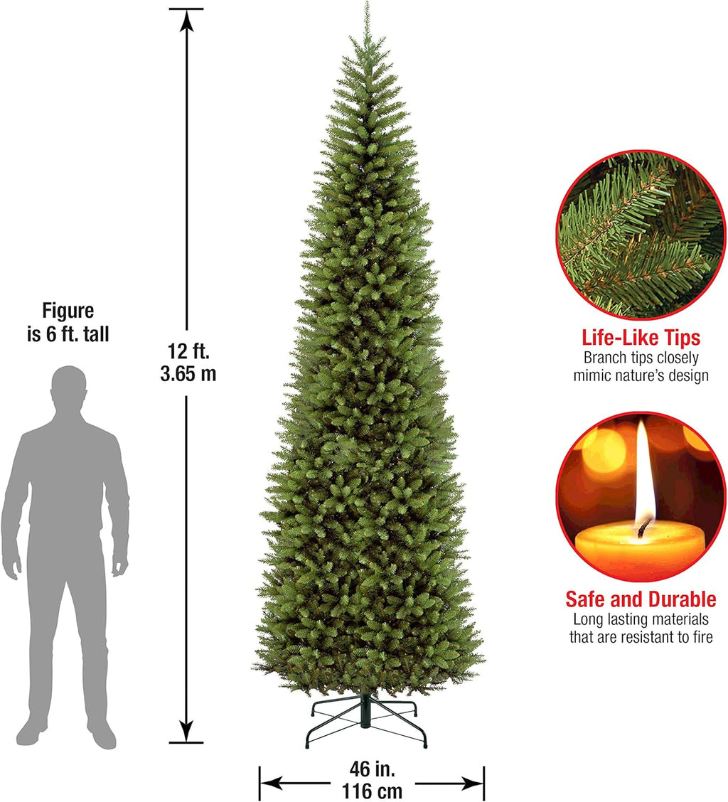 This Fir Slim Artificial Green Christmas Tree is 12 feet tall with a 46 inch base diameter. Featuring hundreds of individually crafted branch tips to create full bodied branches, this tree is designed to look and feel lifelike.