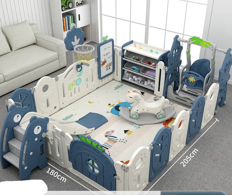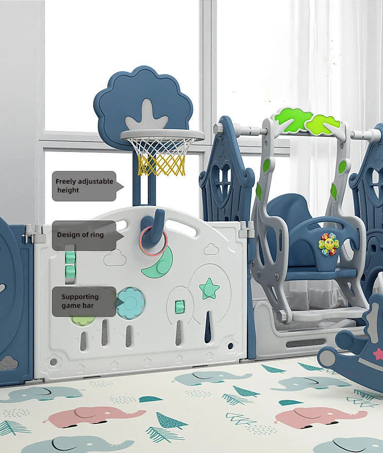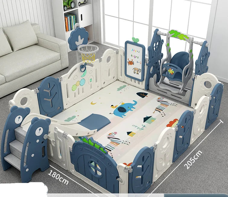 Designed with smooth edges, anti-slip suction cups, and a sturdy interlocking system, this playpen creates a stable environment where your little one can crawl, play, and explore freely. Perfect for active toddlers aged 6 months to 5 years.Built-In Swing & Slide